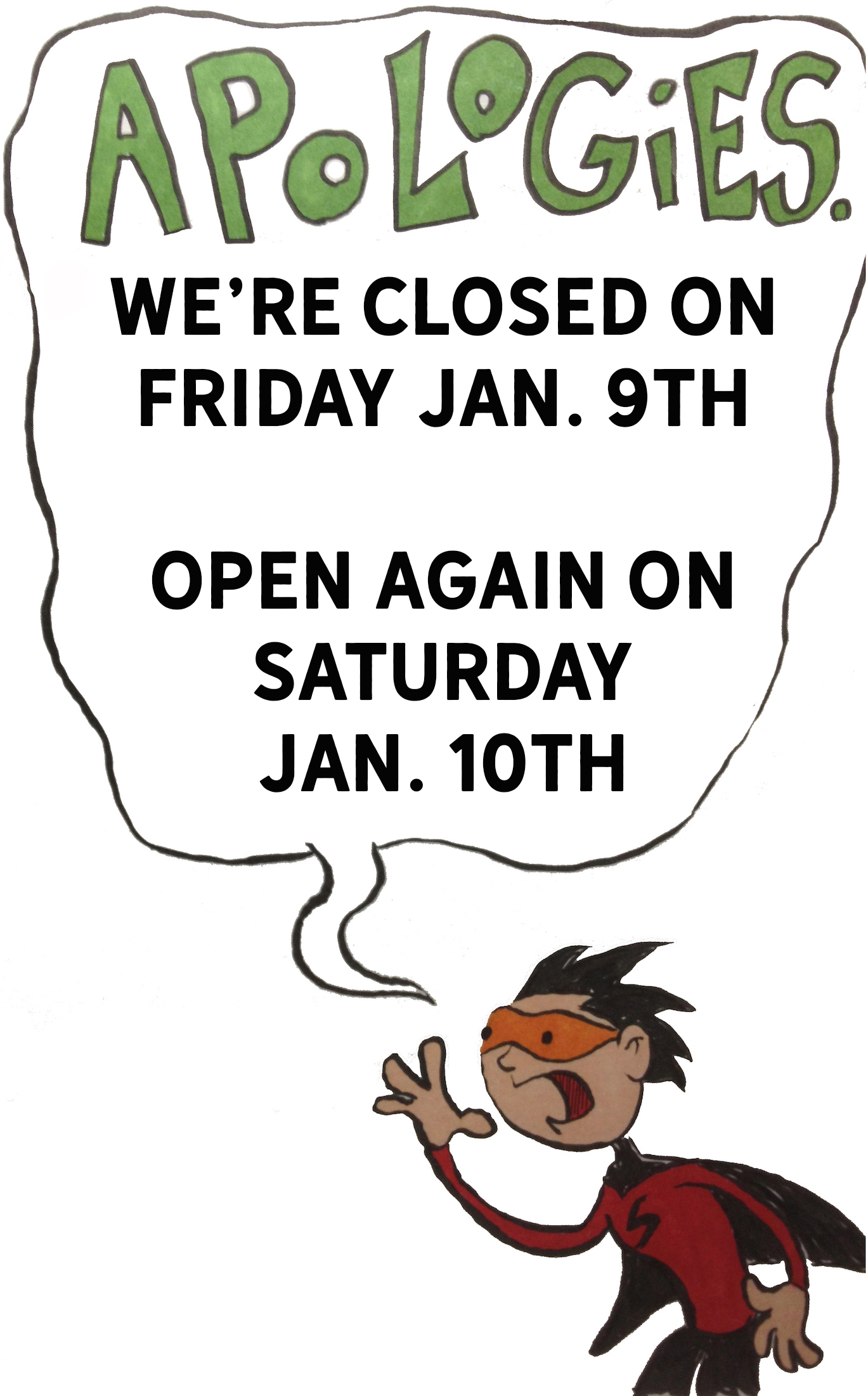 sorry for the inconvenience – we’re closed in Dartmouth today but will be open tomorrow, Saturday, Jan. 10th